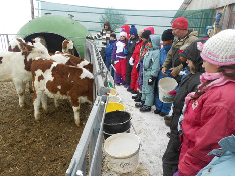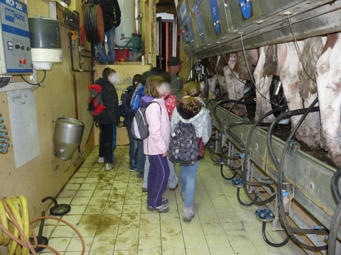 Au cours de la visite de la GAEC, les enfants découvrent l’univers d’une ferme laitière. Grâce aux commentaires du fermier , ils apprennent à distinguer les vaches laitières et les génisses, assistent au fonctionnement de la traite. Ils visitent toutes les installations: étable, grange, salle de traite, … et découvrent ainsi le travail de l’éleveur, rythmé par les saisons.