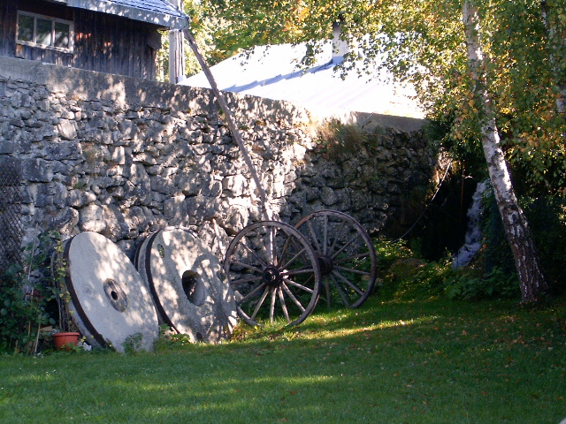 Au hameau du Peuil, vous observerez deux moulins pratiquement l’un en face de l’autre. Le moulin amont a servi à moudre les céréales pour les bêtes (on l’appelle le « moulin noir ») ,puis comme scie à eau jusqu’à la dernière guerre. Le moulin aval servait à transformer le blé récolté ou d’autres céréales en farine ( on l’appelle le « moulin blanc »). Pour les faire fonctionner, le torrent du Peuil était dévié par des canaux qui amènent l’eau au premier puis au deuxième ouvrage.Ils étaient aliments en série : si vous suivez l’eau, elle passe par un caniveau sous la route pour faire fonctionner le 1er moulin, puis elle arrive à la grande roue du 2e moulin par un canal de bois. La grande roue fait tourner une roue d’ancrage ou pignon, avec sur cet ouvrage des engrenages en bois (on peut encore en voir sur place).