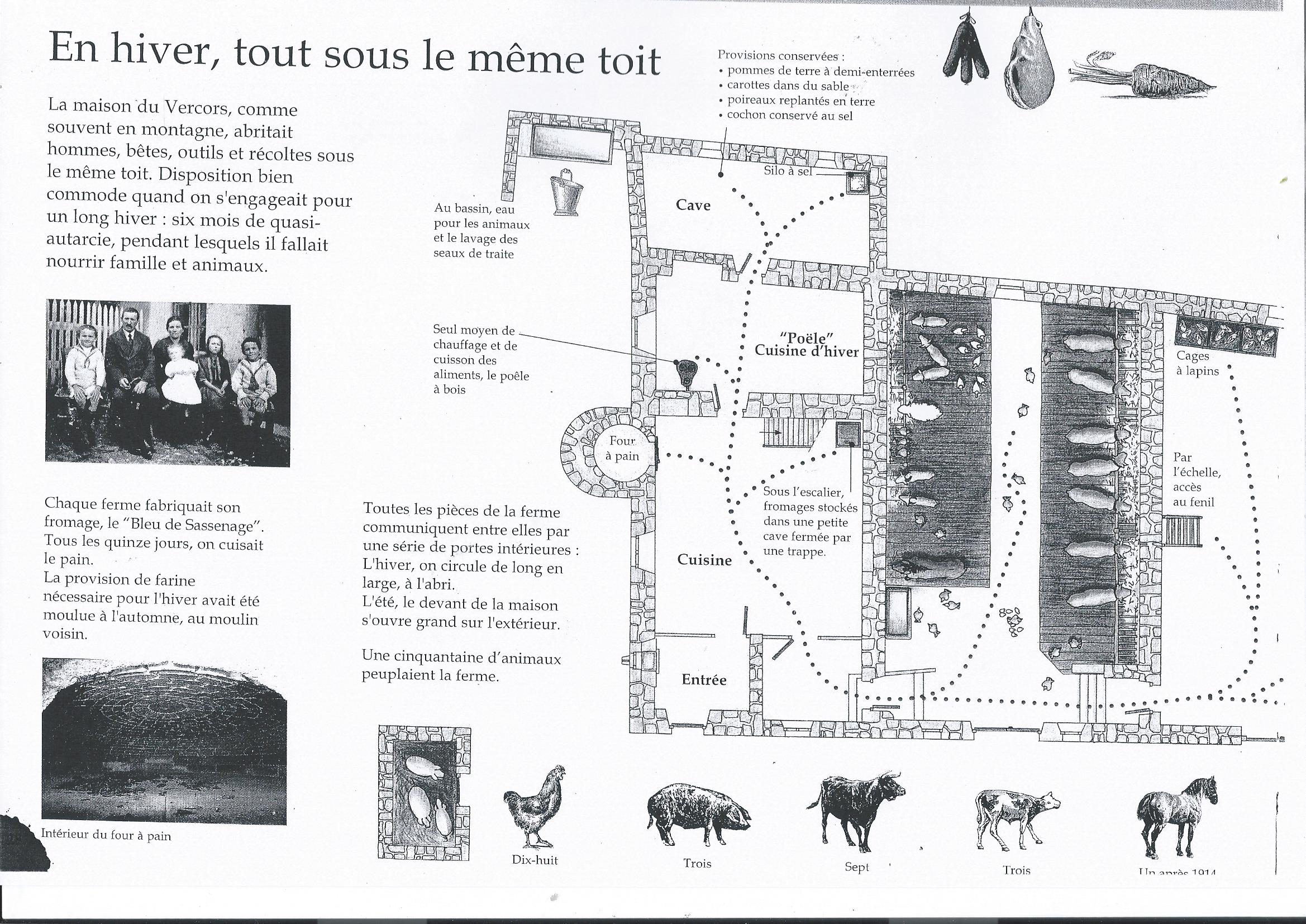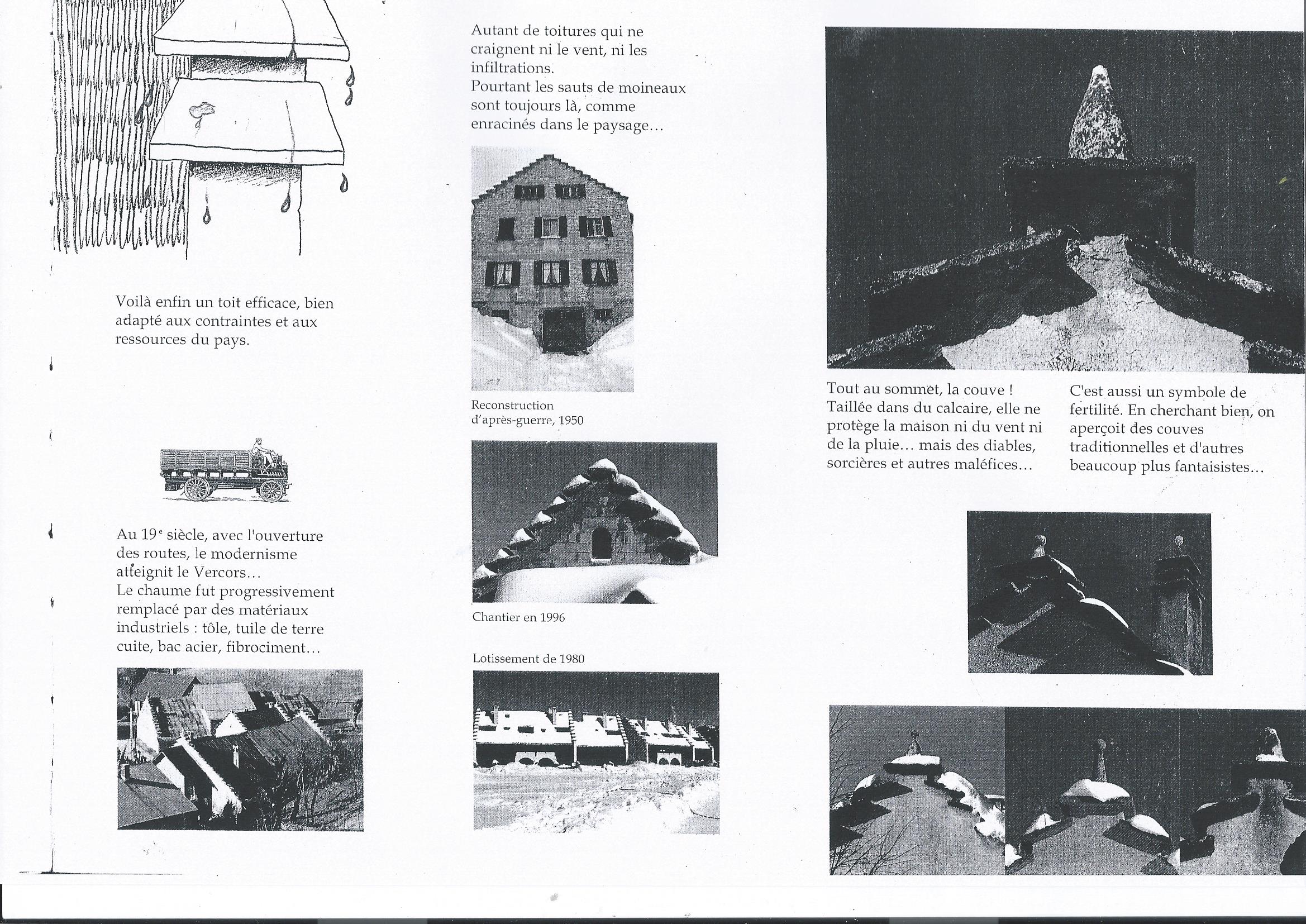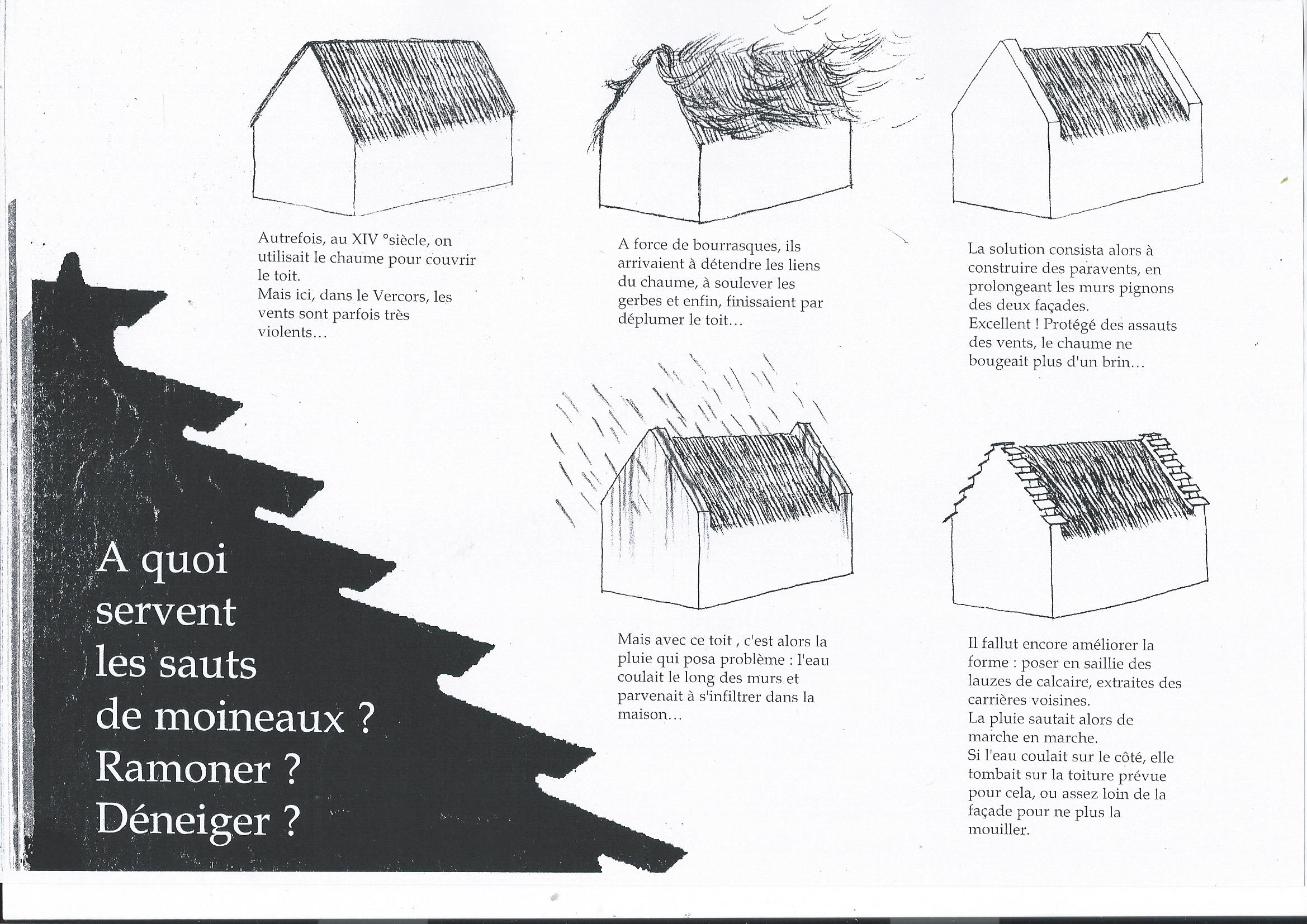 Autrefois, on utilisait le chaume pour couvrir le toit, mais ici dans le Vercors, les vents sont parfois très violents. Ils arrivaient à détendre les liens du chaume, à soulever les gerbes et enfin, finissaient par déplumer le toit.