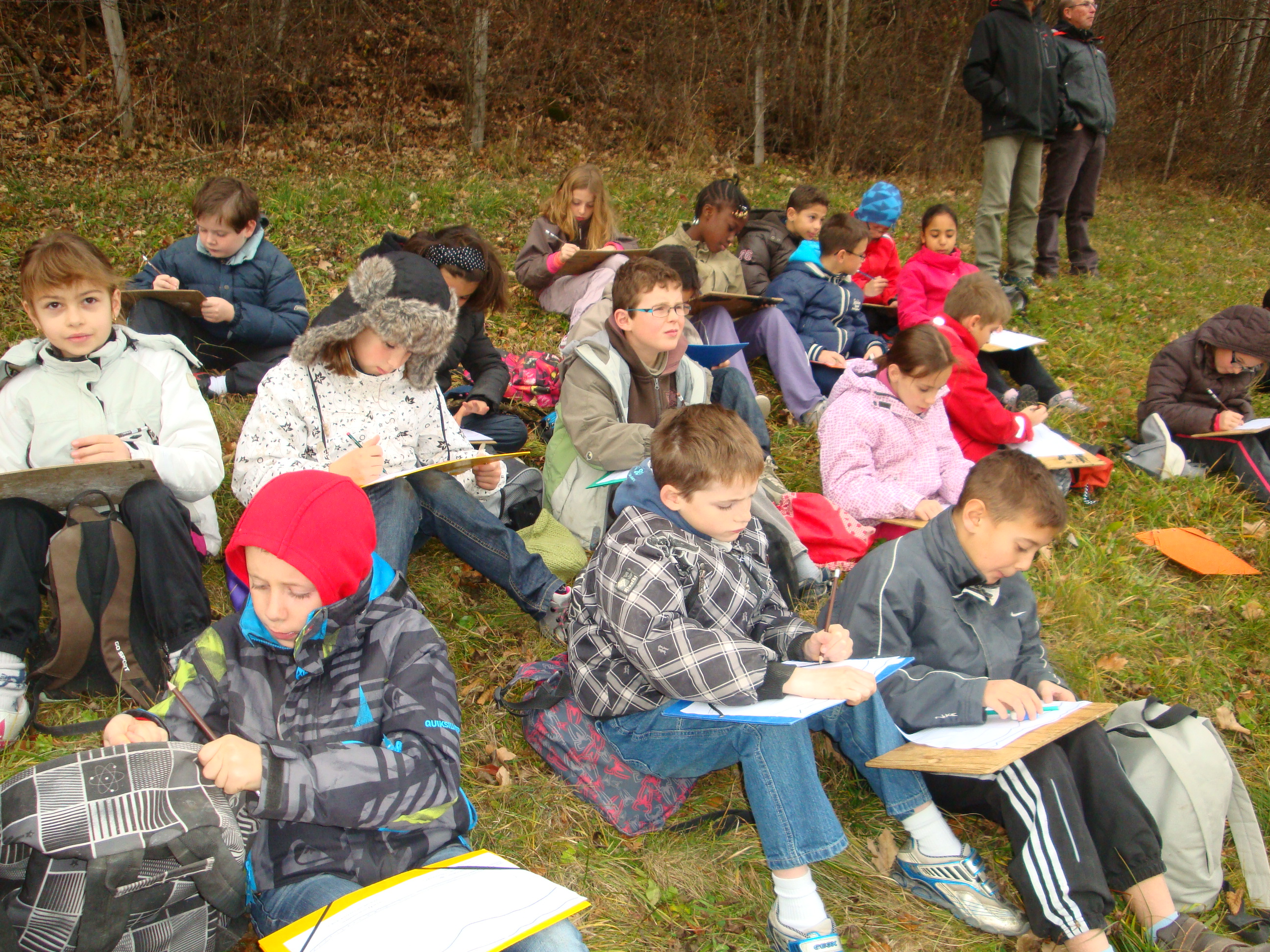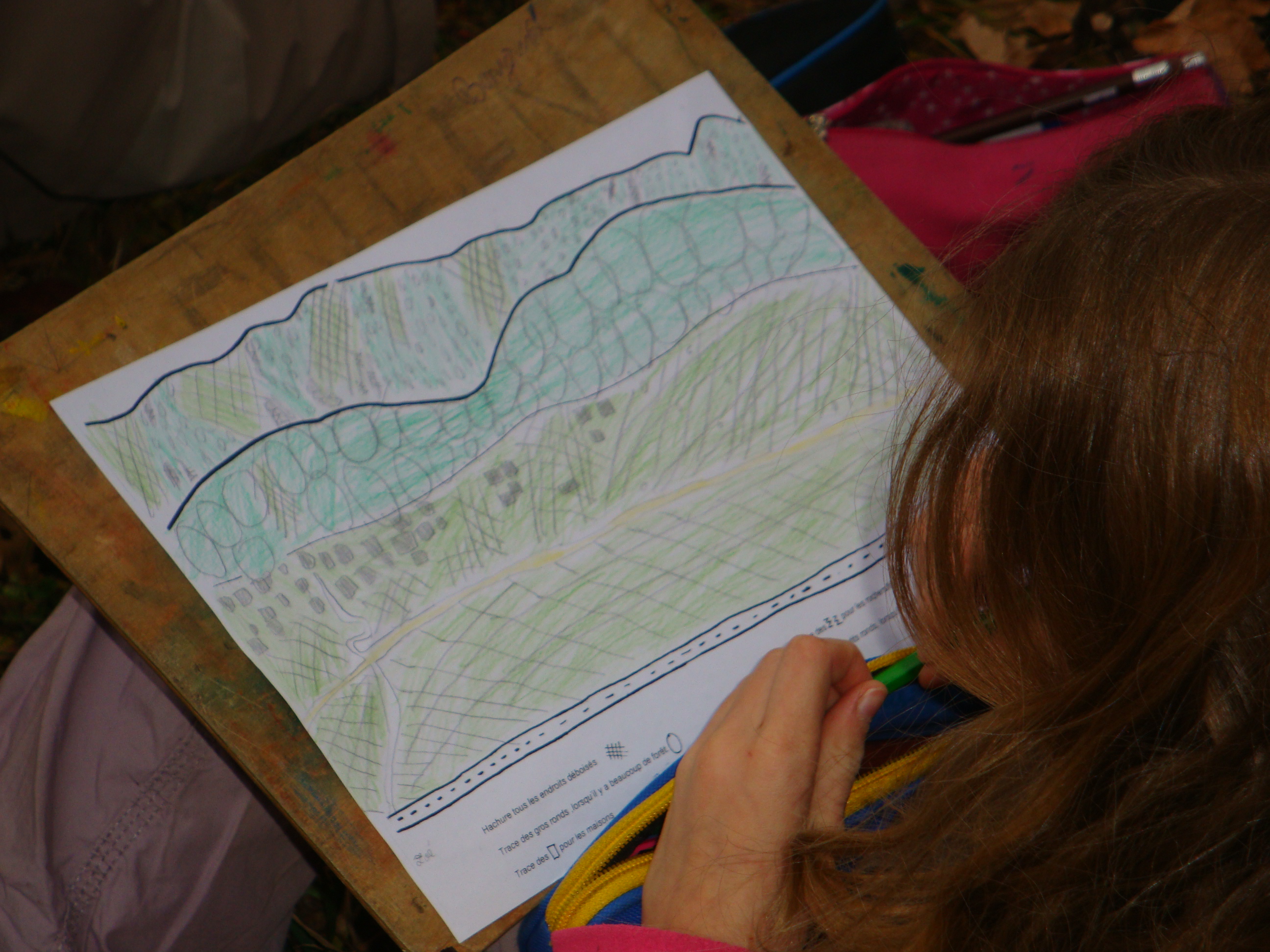 1) Les enfants s’installent à un endroit qui leur assure une vue panoramique sur le plateau et ses contreforts. Chacun dispose d’une planche à dessin et d’une feuille sur laquelle apparaissent uniquement les lignes de crête du paysage qu’ils ont devant eux. La consigne consiste à compléter le croquis en respectant un code, indiqué par une légende (végétation, routes, habitations,…). Les croquis amènent de nombreux commentaires liés à l’observation du paysage et à l’interprétation que l’on peut en faire : pourquoi y a-t-il une trouée dans la forêt ? Pourquoi n’y a-t-il pas de maisons à cet endroit ?