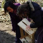 Maintenant que notre charbon a refroidi sans départ de feu nous pouvons passer à la mise en sac. Cette dernière étape consiste à récupérer toute notre production à l’aide d’une resse, sorte de tamis qui permet de supprimer la terre et les petits morceaux. Cette dernière de forme conique facilite aussi le versement dans les sacs. Il ne reste plus qu’à espérer que la pluie ne pointera pas le bout de son nez au risque de rendre le charbon humide et inutilisable.