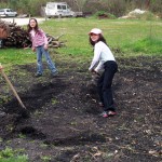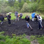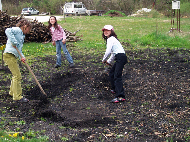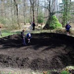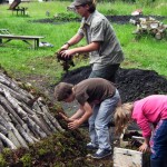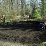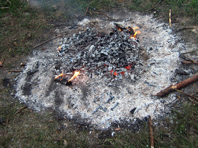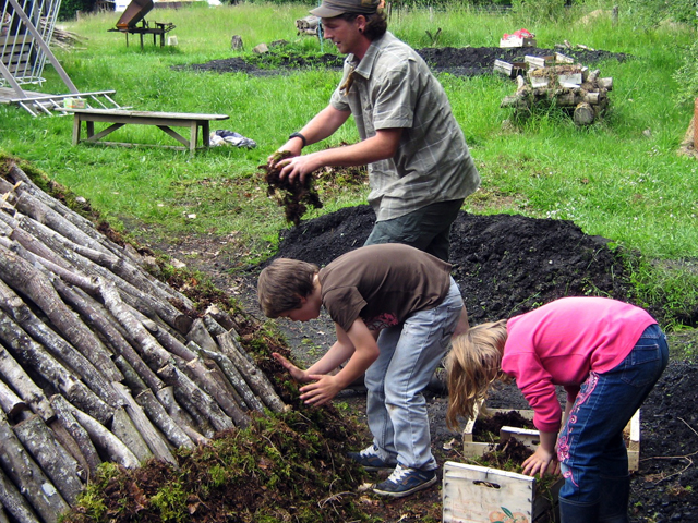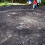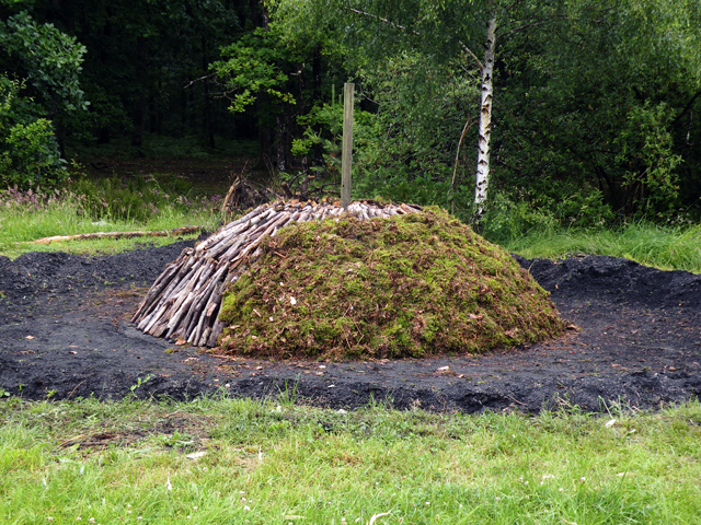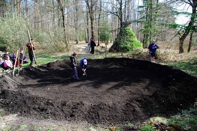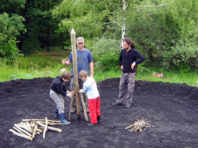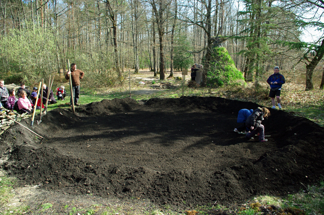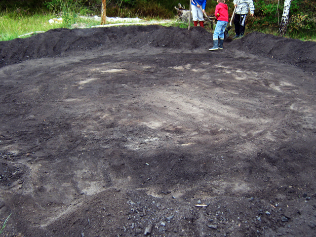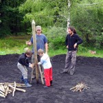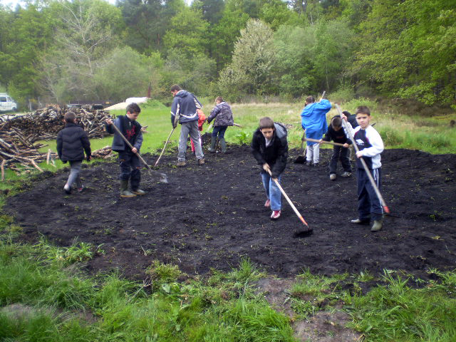 Lors de l’arrivée des enfants, une meule était déjà en place. Avant d’envisager nous aussi d’en construire une, il faut s’assurer que le terrain est convenable. Nous avons besoin d’une charbonnière qui soit la plus plane possible, nettoyée de toutes ses herbes et dont le pourtour est fait d’un cordon de terre meuble et poudreuse. Nous allons pour cela effectuer le terrassement à l’aide de pelles, de râteaux… Le travail d’équipe et l’organisation sont de mise !