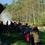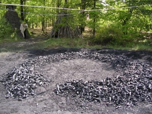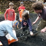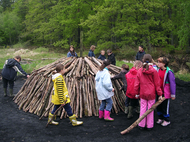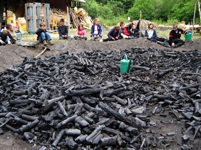 Après avoir découvert sur la charbonnière, la meule construite par la classe précédente  et compris que le charbon s’obtient suite à une longue carbonisation du bois (cuisson à l’étouffée)  les enfants pourront se concentrer sur les missions qui leurs seront confiées.