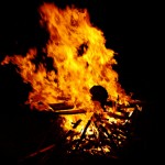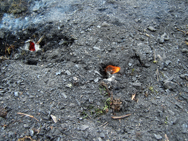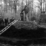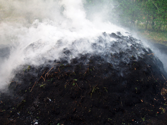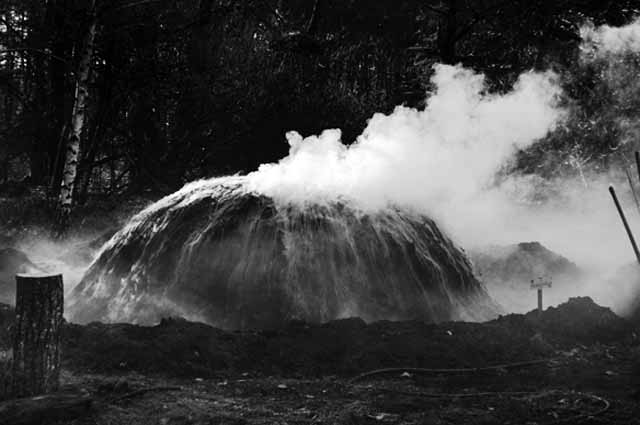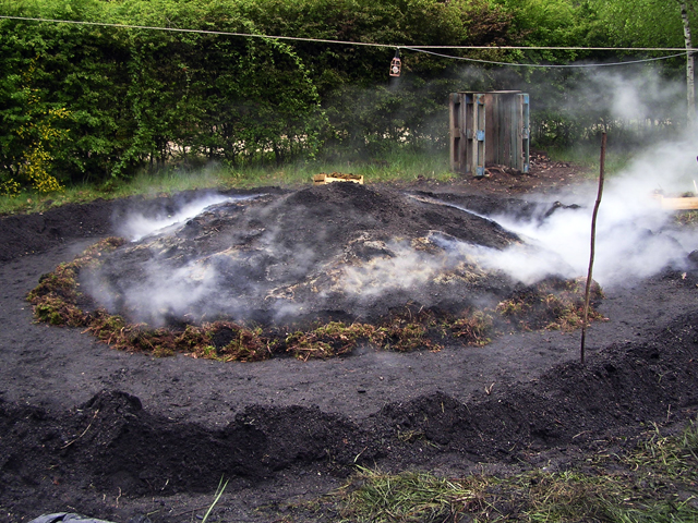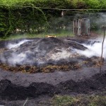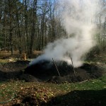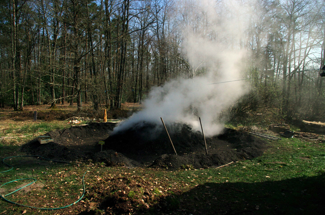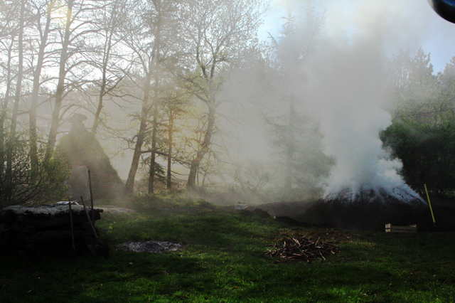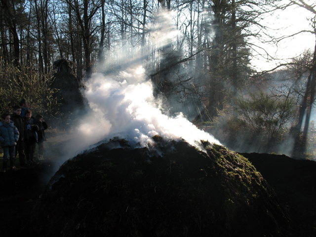 Ce n’est pas l’étape la plus physique du métier mais elle requiert une attention de tous les instants.  Nos charbonniers savent maintenant que lorsque de la fumée bleue sort de la meule, il y a de l’oxygène qui pénètre. Cela trahit la présence d’un trou, ils se relaient par petits groupes, pour effectuer une surveillance et reboucher avec mousse et terre si nécessaire. Le va et vient durera comme cela toute la journée. Un adulte charbonnier veillera toute la nuit pour les mêmes raisons.