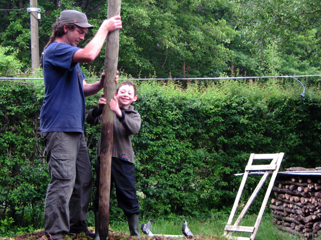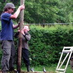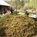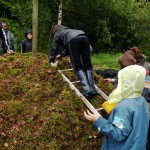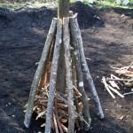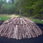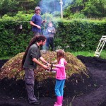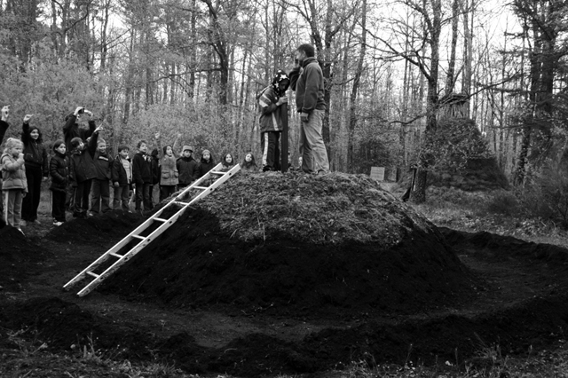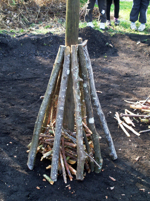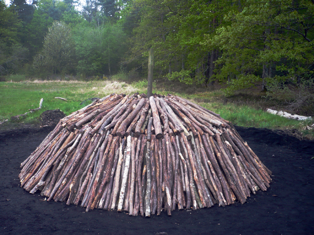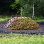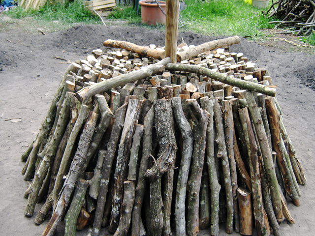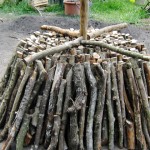 Durant la cuisson, le charbonnier ne reste pas inactif. Nous commençons la fabrication de la nouvelle meule. Première étape positionner le pieu d’allumage au centre de la charbonnière. Les enfants vont devoir se questionner, expérimenter pour trouver cet emplacement précis. S’en suivra la mise en place de petit bois et les premiers morceaux de charbonnette le long du piquet. Un rang de plus,  puis le suivant et encore un autre… jusqu’à épuisement de nos 4 cordes de charbonnettes stockées sur le coté.
