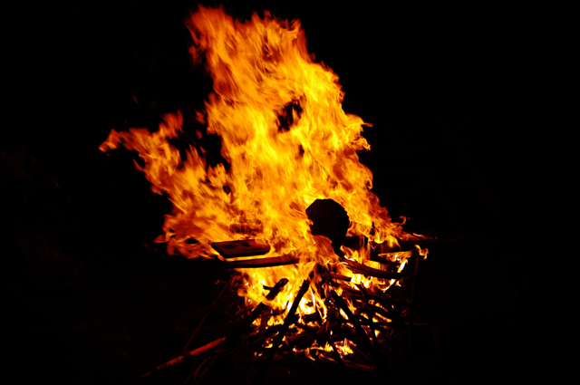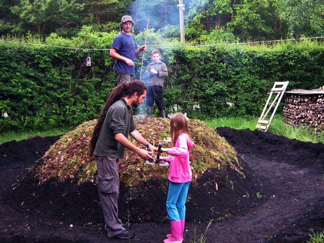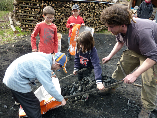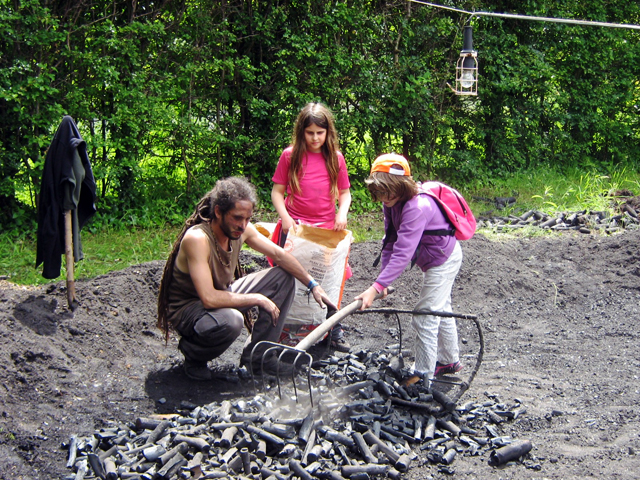 Nous reparlons tous ensemble des étapes de fabrication du charbon afin de se souvenir dans quel ordre nous devons pratiquer l’allumage.  Après avoir enlevé le pieu central, les enfants accompagnés d’adultes apportent les pelles de braises au charbonnier perché au sommet du monticule de bois. Il les fait tomber à cœur. C’est parti pour 30 à 40 heures de cuisson.