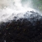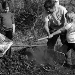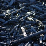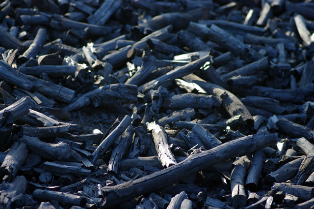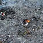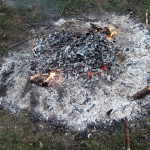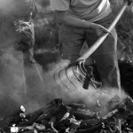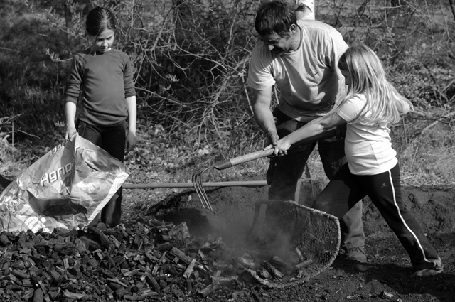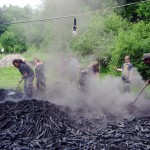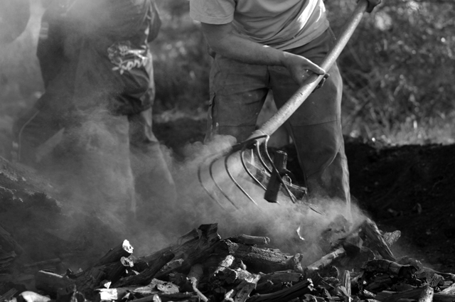 Avec les raclettes, nous allons enlever la terre se trouvant à la surface de la meule pour la remettre sur le cordon et éviter de remplir nos sacs avec. A l’aide des crochets, des griffes, nous allons maintenant pouvoir ouvrir et étaler le charbon sur l’ensemble de la charbonnière. Nous allons observer s’il y a d’éventuels départs de feu à éteindre. Il arrive souvent que de petits foyers se réveillent avec l’apport d’oxygène. Autour de nous la poussière noire s’envole, le charbon crépite, il fait chaud mais nous pouvons enfin apprécier le fruit de notre labeur. Les yeux s’émerveillent à la vue de tout ce charbon étalé devant nous, tout ce bois qui était méticuleusement agencé il y a encore quelques jours. Nos visages sont noirs mais nous pouvons apercevoir le blanc de nos dents derrière nos sourires.