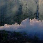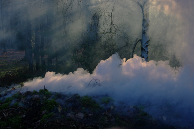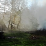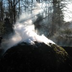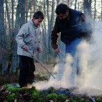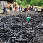 Mardi matin  6h30, nous nous levons plus tôt qu’à la normale… C’est l’heure pour les charbonniers de se rendre auprès de leur meule recouverte de mousse la veille. Pour avoir une quantité suffisante de braises, un feu est déjà allumé dans la clairière.